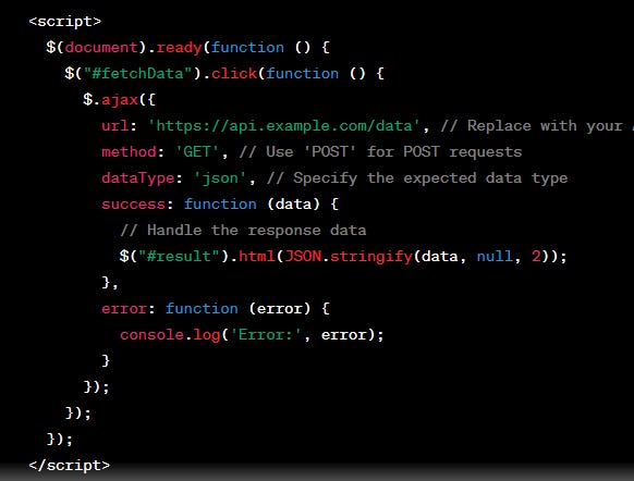 $.ajax()to send an HTTP GET request to the API endpoint. You can change theurlandmethodas needed for your specific API.Handle the response in the