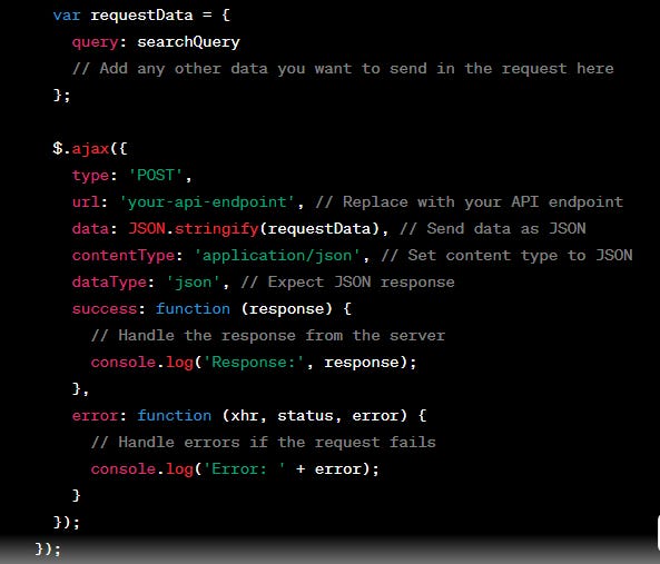 - The AJAX request is set up to send a POST request to your API endpoint with the search query as data.