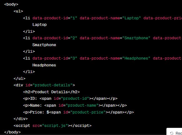 Let's say you have a list of products, and each product has some associated data such as an ID, name, and price. You want to create a feature that displays product details when a user clicks on a product. You can use data attributes to store this information and capture it when a product is clicked.