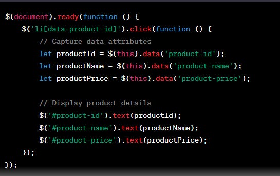 $(this).data('data-attribute')to capture the values of the data attributes. For example,$(this).data('product-id')retrieves the product's ID.We update the content of the product details