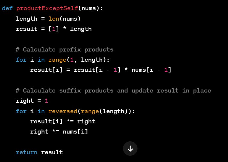 result[i]withright, we effectively get the product of all elements in the array exceptnums[i].This method ensures that each element in the