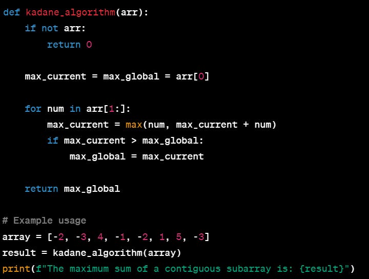 Kadane's Algorithm is a dynamic programming approach used to find the maximum sum contiguous subarray within a one-dimensional array of numbers. This algorithm is particularly well-suited for problems where you need to find a contiguous subarray (sequence of elements) with the largest sum in a given array, and it's a common question in FAANG (Facebook, Amazon, Apple, Netflix, Google) interviews.