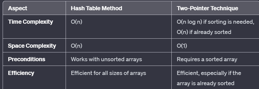If the array is already sorted, the Two-Pointer Technique is an excellent choice for the Two Sum problem. If the array is not sorted, the Hash Table Method is generally the better choice for the Two Sum problem. This method offers a good balance between time efficiency and simplicity.