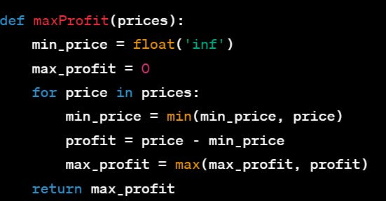 And so on….Final Result => After iterating through all the prices, the max_profit is 5, which is the maximum profit achievable from this transaction.