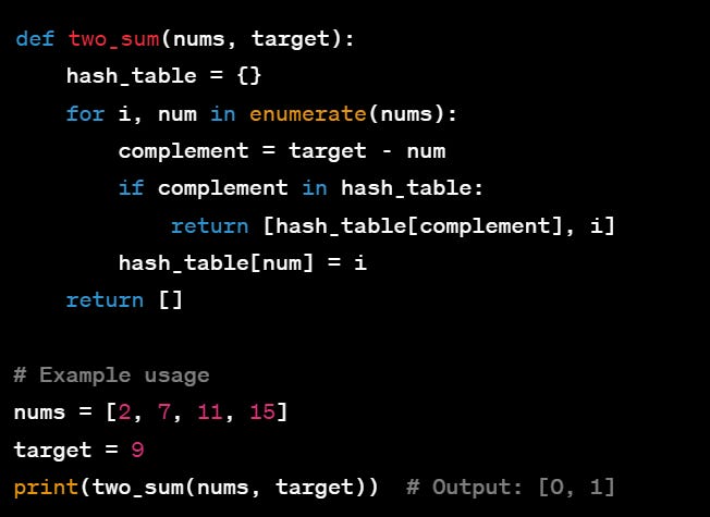In this example, the hash table helps us quickly check whether the complement of each number (needed to reach the target) has already been seen in the array. Once we find such a complement, we immediately have our solution.
