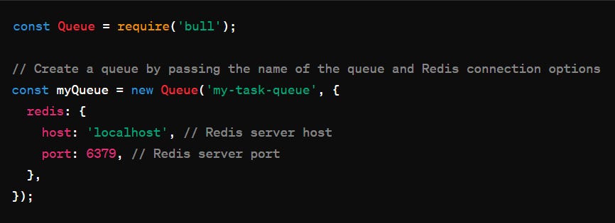 You can create a queue by simply instantiating a Bull queue object. Here's how you might set it up: