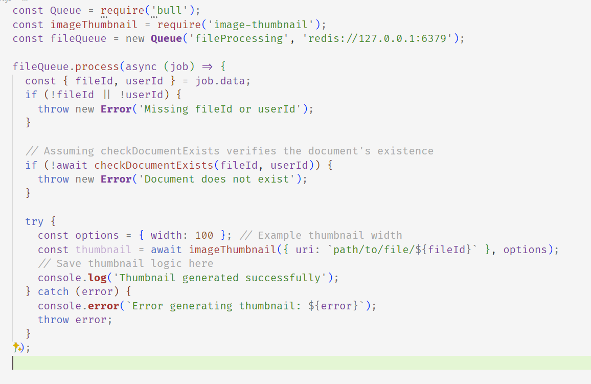 Now, you need to set up a Bull queue that will handle the jobs for thumbnail generation.