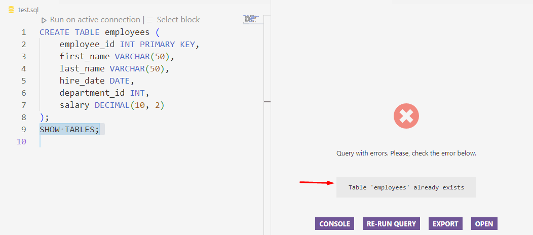 - Highlight the `CREATE TABLE` query or any other query you want to execute.
