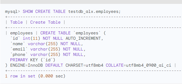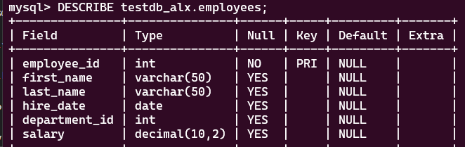 mysql> SHOW COLUMNS FROM testdb_alx.employees;