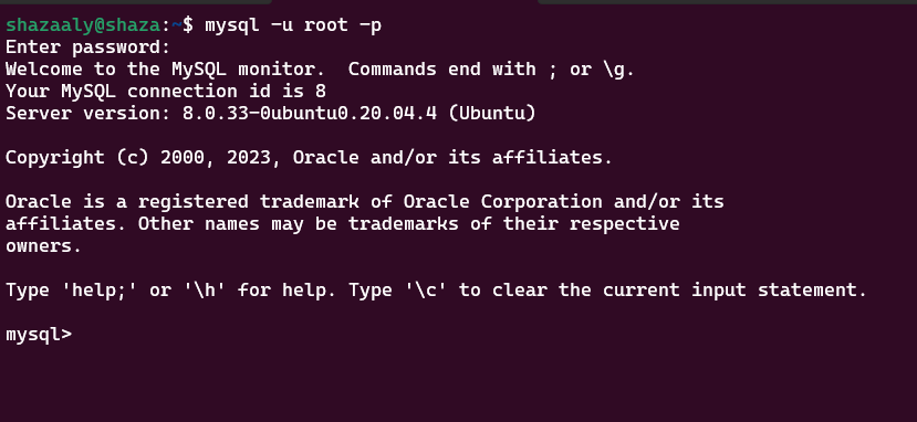 Open your terminal or command prompt and start the MySQL command-line client by entering the following command. You will be prompted to enter your MySQL root password.