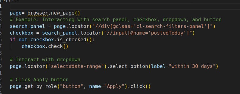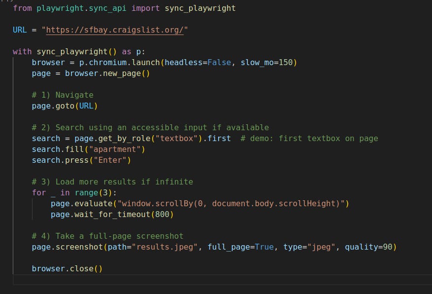 xpath_input = "//input[@placeholder='search craigslist']" page.wait_for_selector(xpath_input, timeout=5000) page.locator(xpath_input).fill("apartment") page.locator(xpath_input).press("Enter")