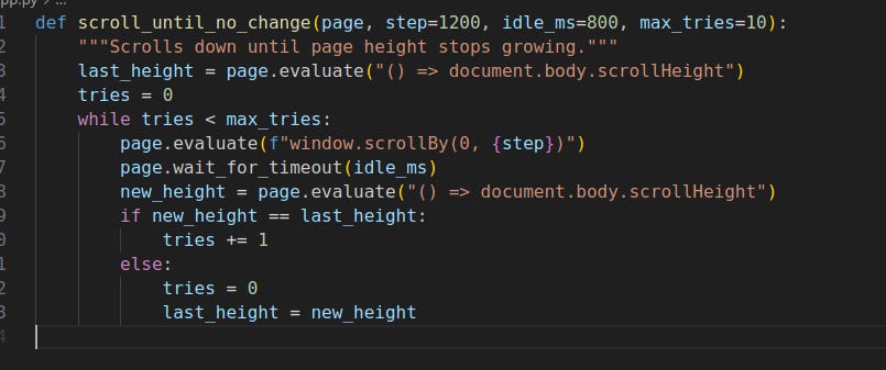 while not page.locator("text=Target Post").is_visible(): page.evaluate("window.scrollBy(0, 1200)") page.wait_for_timeout(800)