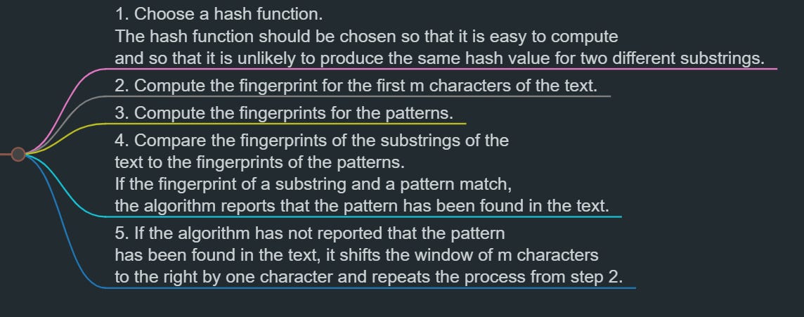 “The basic idea of the Rabin-Karp algorithm is to use a hash function to compute a fingerprint for each substring of the text. The fingerprint for a substring is a unique number that represents the substring. The algorithm then compares the fingerprints of the substrings of the text to the fingerprints of the patterns. If the fingerprints of a substring and a pattern match, the algorithm reports that the pattern has been found in the text.”