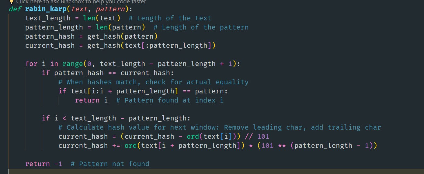1. **Hash Function**: Rabin-Karp uses a hash function to convert each substring of the text and the pattern into a numerical value. The idea is that it's faster to compare integers than strings.